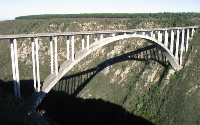 The Bloukrans Bridge Bungee is the world’s highest commercial bridge bungee. We’re talking 216 meters of drop; that’s terrifyingly high. The walk-out onto the catwalk to the jump point itself is sufficient to weaken your knees.